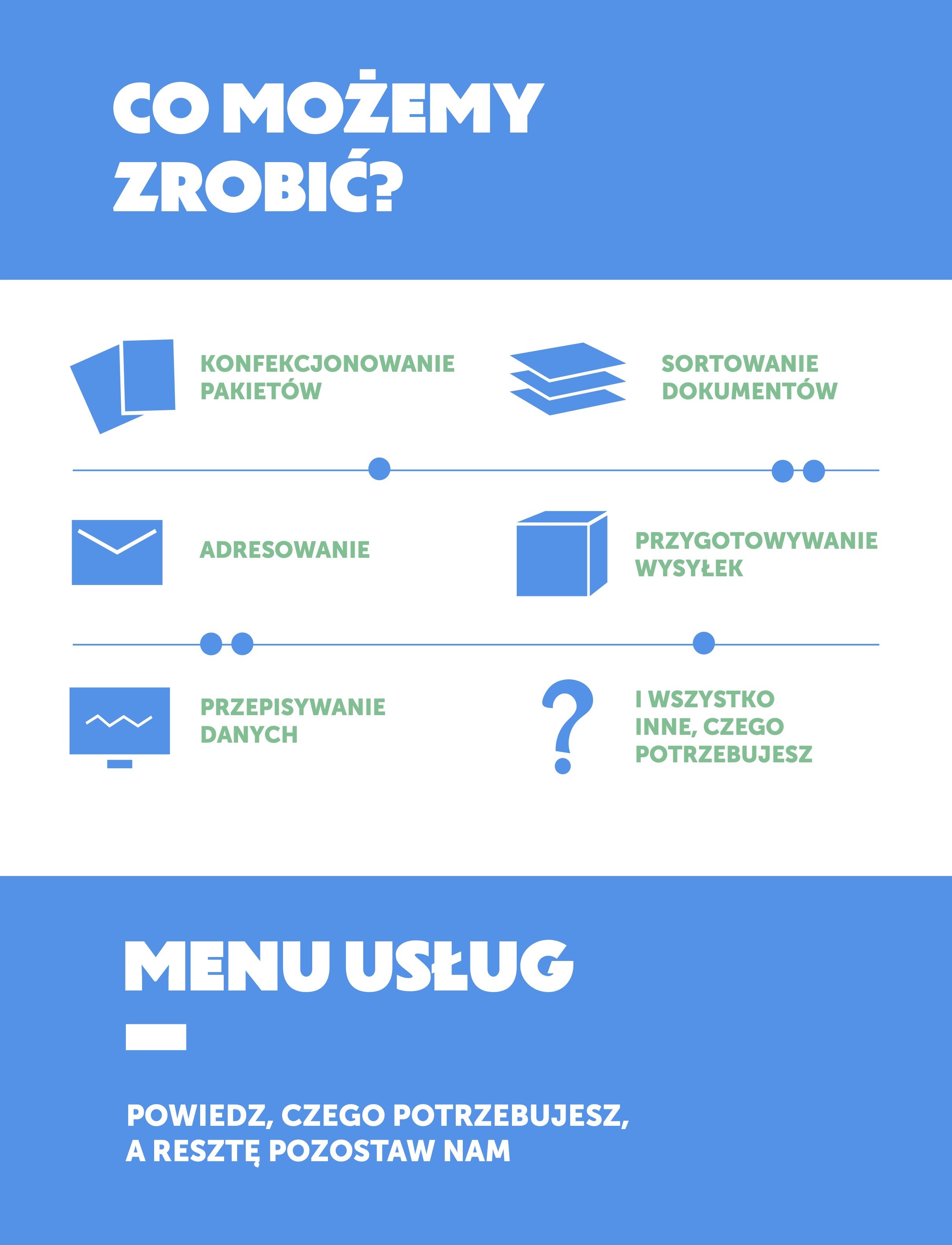 Nasi pracownicy szukają Ciebie. Zleć nam proste prace, a Twoi ludzie zyskają czas na naprawdę ważne dla Was zadania. Przygotujemy dla Ciebie: